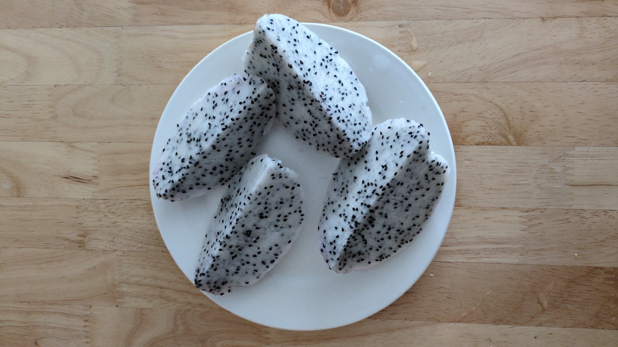 - "Four pieces of white dragon fruit are arranged on a white, round plate" by FM-MreoF3, licensed under CC BY 4.0