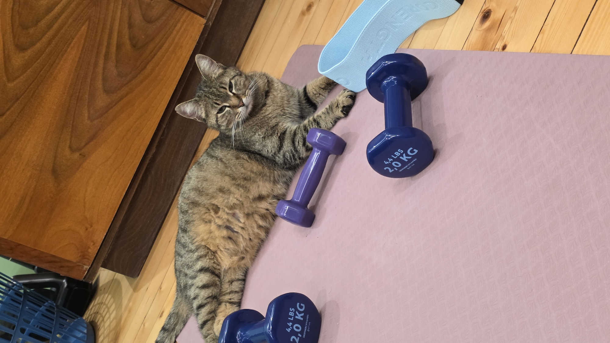 - "An indoor scene in Staroseltsi, Bulgaria, features a brown tabby cat resting on a pink yoga mat" by FM-3O4tD2, licensed under CC BY 4.0