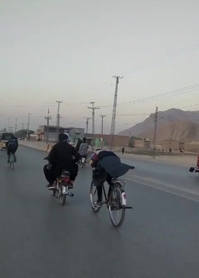 two people riding in the same direction on a road. One person is riding a motorcycle, and the other is riding a bicycle. The person on the bicycle is bent over low, appearing to put a lot of effort into pedaling. The motorcycle rider is wearing a black jacket and pants. The bicycle rider is wearing a dark outfit with a larger bundle on his back, possibly secured with straps. A car and some buildings are visible in the background. It appears to be dusk or early evening. There is a mountain range in the distance, and a series of utility poles line the roadside. There is some traffic noise.