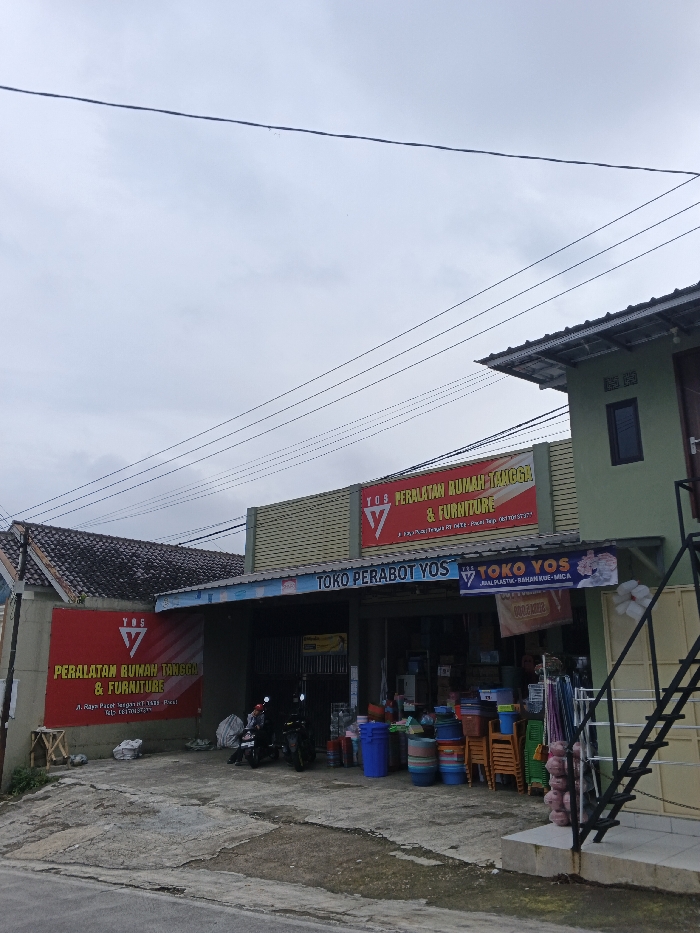 A street-level, full-frame photograph depicts two adjacent commercial buildings under an overcast sky. The primary structure, a multi-story building on the right, features a ground-floor retail establishment named "Toko Perabot Yos" (Yos Furniture Store) with an open storefront. Large red and yellow banners above and on the left building advertise "Yos Peralatan Rumah Tangga & Furniture" (Yos Household Appliances & Furniture), with a specific address "Jl. Raya Pacet Jagarayu RT 14/05 - Pacet" printed on the main sign, indicating a location in Indonesia. A smaller banner on the right of the storefront specifies "Toko Yos Jual Plastik - Bahan Kue - Mica" (Yos Store Selling Plastic - Cake Ingredients - Mica). The store displays numerous colorful plastic household items, including buckets, basins, and stacked chairs, both inside and extending onto the concrete forecourt. Two dark-colored motorcycles are parked directly in front of the store. The building on the far left, connected to the main store, also features a red banner similar to the main signage. The rightmost section of the main building is light green with a dark-framed window and a dark door on an upper floor, accessed by an external black metal staircase. Multiple overhead utility wires cross the upper portion of the frame. No individuals are visible, and no overt actions are depicted.