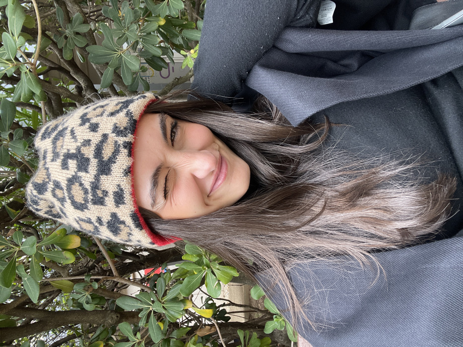 A young adult female is depicted in a close-up, outdoors in an urban setting in Montpellier, France. She wears a leopard-print knit beanie with a red brim, a black turtleneck, and a black coat. Her dark brown hair is long, extending over her shoulders. She is winking with her right eye and smiling with a closed-mouth expression, her face showing crinkles around her eyes. Her head is slightly tilted to her left. Her left arm is partially visible, bent at the elbow, with her gloved hand (out of frame) positioned near her head, and her black coat sleeve showing scattered lint. The background consists of dense green foliage from a tree or large bush, with some leaves exhibiting yellowish discoloration. Behind the foliage, blurred elements suggest a light-colored building wall and a subtle purple sign with indistinct white lettering, possibly "C&" or "O&".