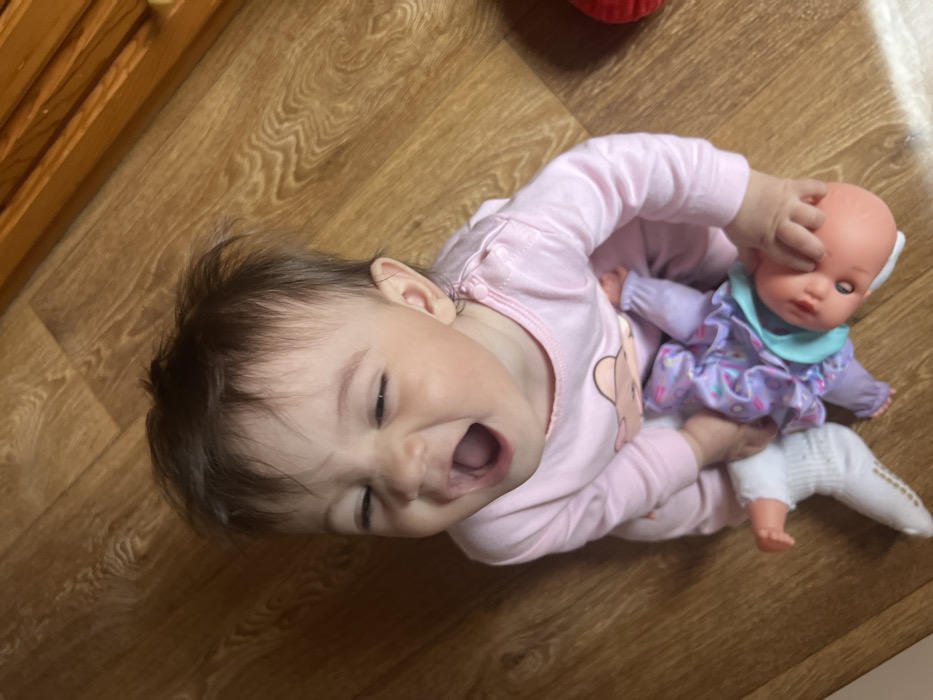A young child is depicted sitting on a light brown wooden floor indoors, in what is identified as the city of Elena, Bulgaria. The child has dark hair and is wearing a long-sleeved light pink onesie with a light brown graphic design on the chest. Their mouth is open wide in an expression consistent with yelling or laughing, and their eyes are tightly squinted. The child is holding a baby doll by its upper torso/neck area, causing the doll to be inverted. The doll has a peach-toned head and body, and is dressed in a lavender outfit with a light blue collar. One of the doll's feet is clad in a white sock with non-slip dots. In the upper right background, a portion of light brown wooden furniture is visible, while a white, textured mat or rug is partially visible in the lower right foreground.