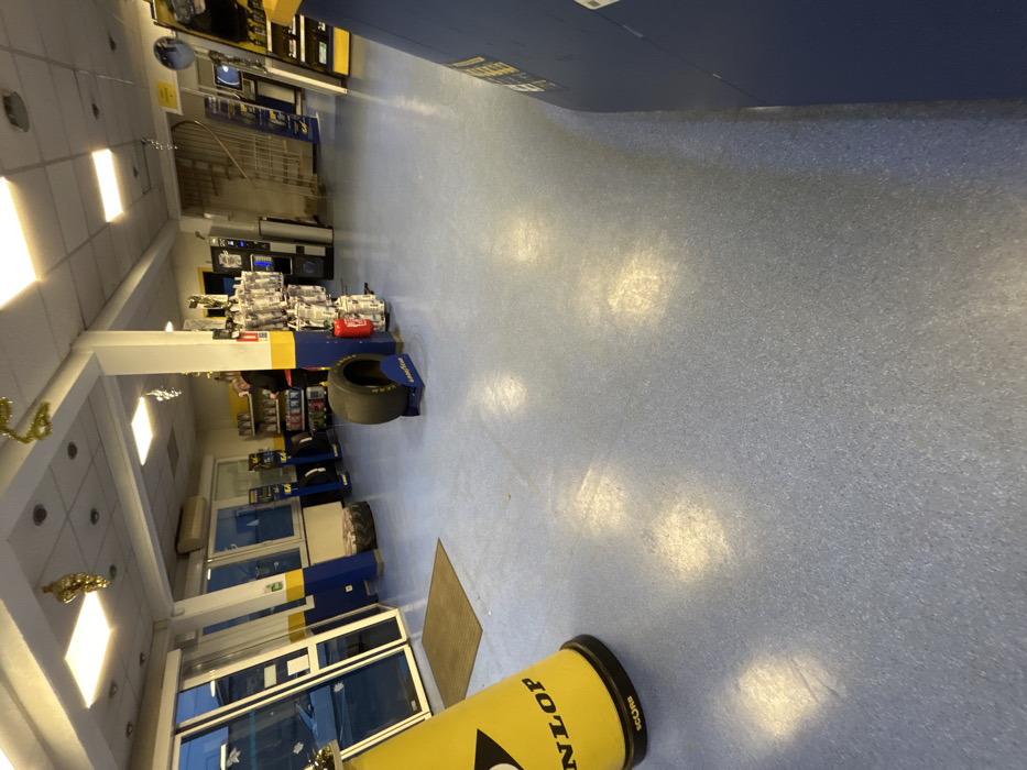 The scene is an interior of a bright store with a blue floor. Automotive tires, possibly for race cars, are prominently displayed. There are engine components, like manifolds, on display as well. Yellow tubes with black writing, potentially automotive products, are on the bottom of the frame. The building is well-lit, with several overhead lights and large storefront windows.