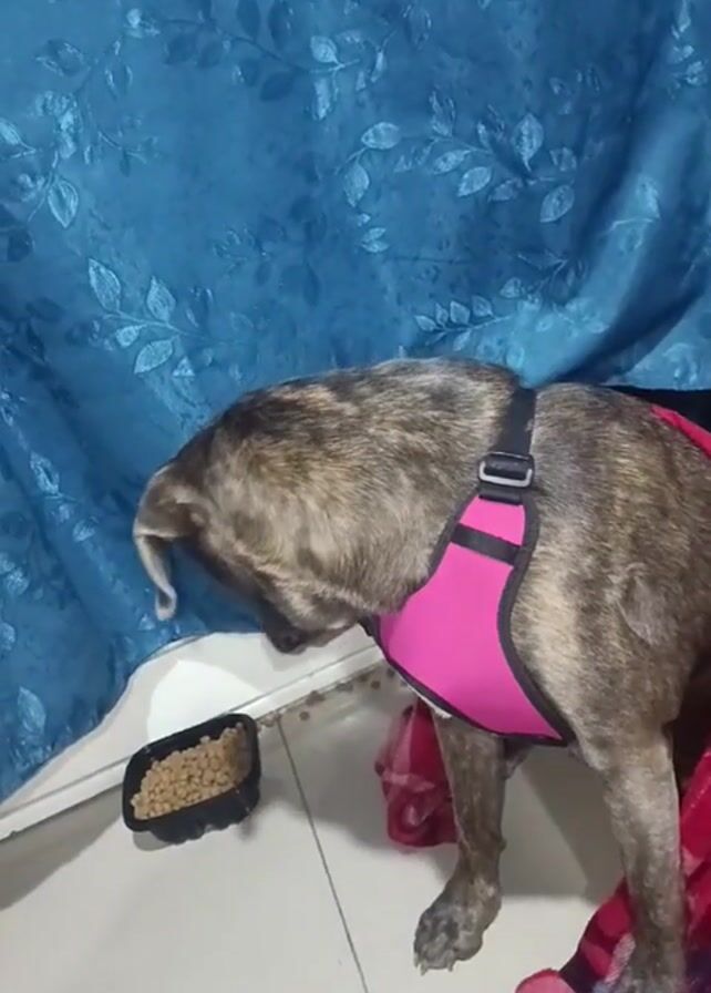 medium-sized, brindle-colored dog wearing a pink harness. The dog is standing near a black plastic container filled with dog food on a white tiled floor. A red and black plaid blanket is bunched behind the dog. In the background is a blue curtain with a leaf pattern. The dog appears to be sniffing around the container of food.