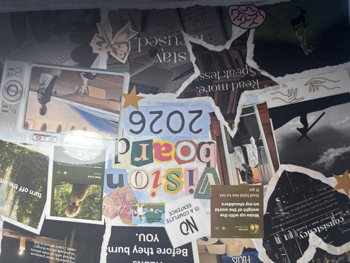 The image displays a detailed vision board, reportedly located in the city of Port Alfred, South Africa. The board is a collage composed of various cut-out images, text, and decorative elements. **Upper Left Quadrant:** * A heart-shaped, torn paper cut-out features the word "consistency" with its dictionary definition printed in black text on a grey background. * Below this, a black and white image depicts a silhouetted figure carrying a large cross on a hilltop against a dark, cloudy sky. Below this, an illustration of two hands, one open palm up, the other reaching downwards, is visible. * A yellow star-shaped sticker is positioned to the left of the heart-shaped cut-out. * An image resembling a Spotify music player interface displays "Let It Go" by Avery Dooley, with lyrics "Woke up with the weight of the world on my shoulders God told me to let it go." * A vertical photograph shows a person, likely male, in a white shirt and dark tie, taking a mirror selfie with a smartphone, reflecting the phone in their right hand. **Upper Right Quadrant:** * A bold black text block reads "habits before they burn YOU." * Another black text block states "NO IS A COMPLETE SENTENCE." * A small image features cartoon characters, including a rooster and chickens. * A motivational quote reads, "my parents never pressure me but with all their efforts to provide all the things I need, I can't afford to fail," positioned next to an image of a lit candle. * An image resembling a Spotify music player interface shows a young woman with short blonde hair, outdoors in a green environment, with the text "Dear Lord" by RUVA. * A partial text cut-out reads "turn off the inte" (likely intended as "internet"). **Central Area:** * The phrase "VISION BOARD 2026" is prominently displayed using multi-colored, varied font cut-out letters, reminiscent of magazine clippings. **Lower Left Quadrant:** * A photograph depicts a male figure in a green field, possibly a statue or a person striking a pose, against a dark sky. * A pink illustration of a human brain is positioned near the bottom edge. * A torn paper section features the text "Read more. Speak less." * Below this, a section of what appears to be a notebook or textbook with handwritten notes and diagrams is visible. **Lower Right Quadrant:** * A white digital camera, resembling a Nikon Coolpix model, is depicted. Text on the camera's body reads "10.2 MEGA PIXELS." * The camera's display screen shows a photograph of a person, identifiable as male, wearing a dark long-sleeved shirt, standing on an asphalt surface next to a light-colored private aircraft or small plane. * A text cut-out reads "stay focused." * A beige-colored bow made of ribbon is affixed to the lower right corner. * Underlying elements include torn pieces of newspaper or printed text.