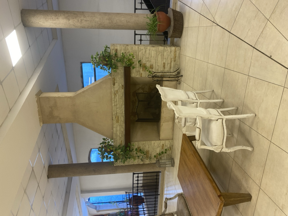 This image depicts an interior common area or lounge, likely a lobby, situated in Canning, Argentina. The scene is dominated by a central fireplace structure with a beige stucco hood tapering upwards from a mantel made of a dark wooden beam, supported by a base constructed from light-toned, stacked stone blocks. Green trailing plants are draped decoratively over both sides of the fireplace mantel. A black metal fire screen covers the firebox opening, and black metal fireplace tools stand to its right. To the left of the fireplace, a textured cylindrical pillar rises, matching another pillar on the far right. In the foreground, a rectangular dark wood coffee table is positioned, flanked by seating. To the left of the table, a partially visible ornate armchair with light grey upholstery and a distressed light-colored wooden frame is present. To the right of the table, two white-painted, ornate armchairs with light-colored upholstery and dark piping face the fireplace, with a third similar chair partially visible further right. The flooring consists of large square light beige ceramic tiles. The ceiling is a suspended grid system with rectangular acoustical panels and several square recessed light fixtures, one of which is brightly illuminated. The walls are plain white. In the background, behind the fireplace, two windows with a distinct blue tint are visible. A black wrought iron railing is present on the left side of the image, suggesting a balcony or a change in floor level, with distant green foliage visible beyond it. Another section of the railing is visible on the far right. A terracotta pot containing a green, spiky-leaved plant rests on a cylindrical wooden stump to the right of the fireplace, and a grey lantern-style decorative item is on the floor near the left pillar. No people are visible in the scene.