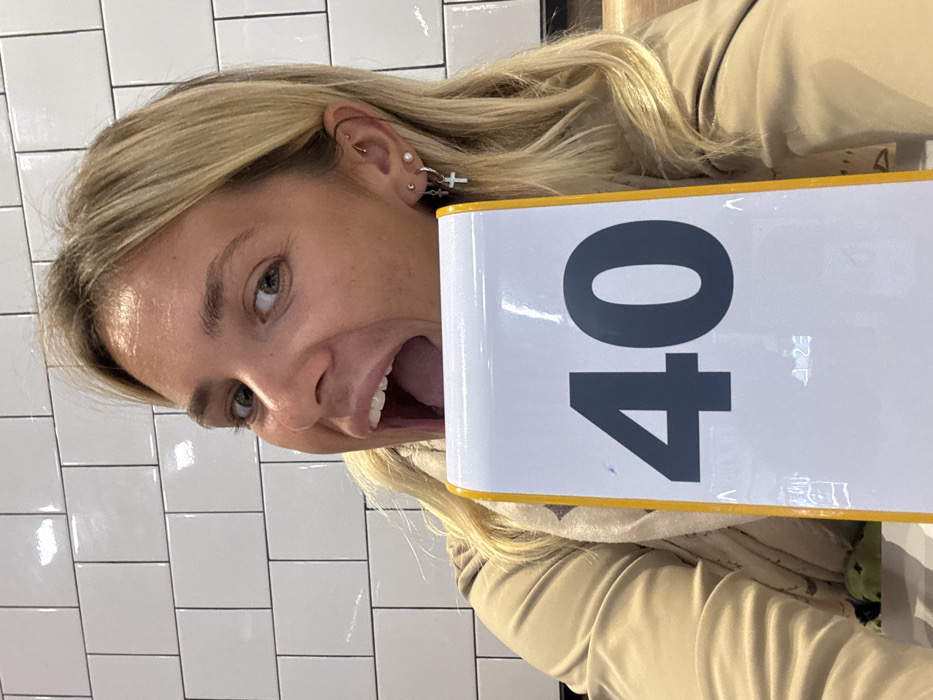 A blonde female, positioned in the foreground, looks directly into the camera with a wide-open mouth expression of surprise or excitement. Her right ear displays multiple piercings, including a cross-shaped dangle earring. She is wearing a light brown or tan jacket or top, with what appears to be a lighter-colored scarf. In front of her, a white, rectangular table number sign with yellow trim prominently displays the dark grey numbers "40." The background consists of white subway tiles. The scene takes place within Nong Prue Subdistrict, Thailand.