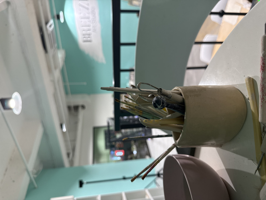 The image depicts an interior view of Breeze Art Studio, located in Yerevan, Armenia. The scene is dominated by a white table surface in the foreground, on which a light beige, elliptical ceramic container holds numerous specialized art tools, including various sculpting and pottery implements, such as wire loops, wooden shapers, ball tools, and paintbrushes. To the left of the tool holder, a pink or mauve ceramic bowl filled with water is visible. Additional tools, including a yellow modeling tool and a white tool with red markings, rest directly on the table surface in front of the container. In the midground, a black metal railing extends across the frame, suggesting a barrier or mezzanine. Beyond this railing, the walls are painted a uniform light teal/mint green. A blurred white sign on the teal wall identifies the establishment as "BREEZE ART STUDIO." The ceiling, visible in the upper portion of the frame, is white and features multiple illuminated track lighting fixtures, including both recessed round lights and rectangular black fixtures. The background shows further blurred studio space, including reflections or faint lights, one of which appears as an elongated red glow. No individuals are present in the image. The environment is well-lit and appears to be an active workshop setting.