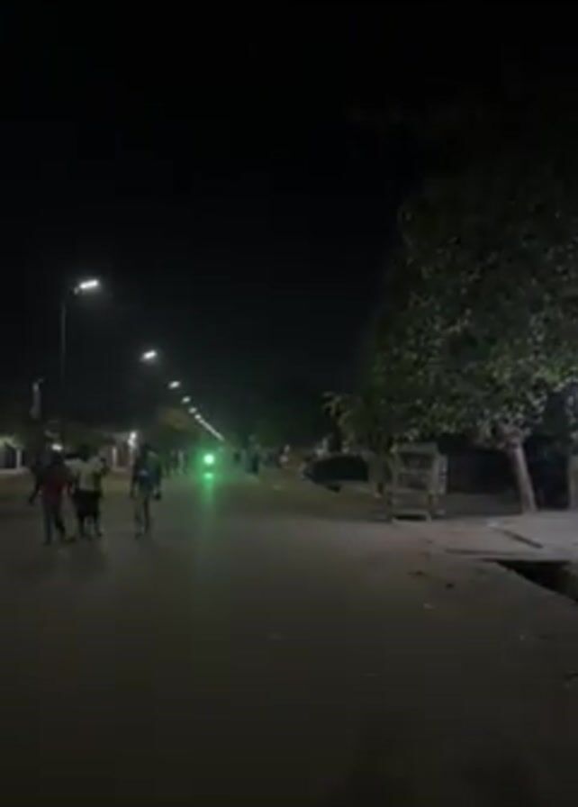 night scene along a street lit by streetlights. Several people are walking along the left side of the road, moving away from the camera. A vehicle with bright headlights is visible in the distance, approaching. There are trees lining the right side of the road, and some structures are visible in the background. The overall scene is dark, with the streetlights providing the primary source of illumination.
