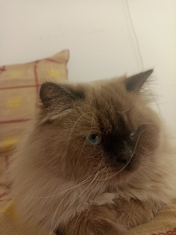 - "The image displays a close-up, head-and-shoulders view of a long-haired domestic cat with seal point coloration, located indoors in Mu'adammiyat ash-Sham, Syria" by FM-gHPc12, licensed under CC BY 4.0