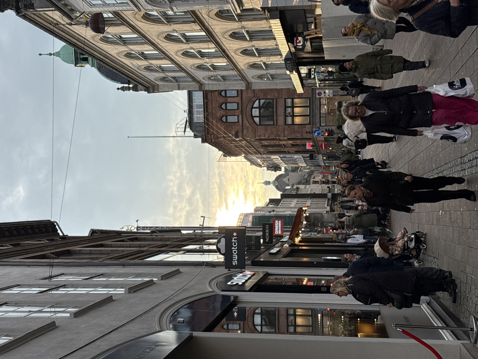 - "This image depicts a bustling pedestrian street scene on Købmagergade in Copenhagen, Denmark, looking generally west towards the Church of Our Lady (Vor Frue Kirke), whose green dome and spire are visible in the distant background" by FM-kiqHy2, licensed under CC BY 4.0