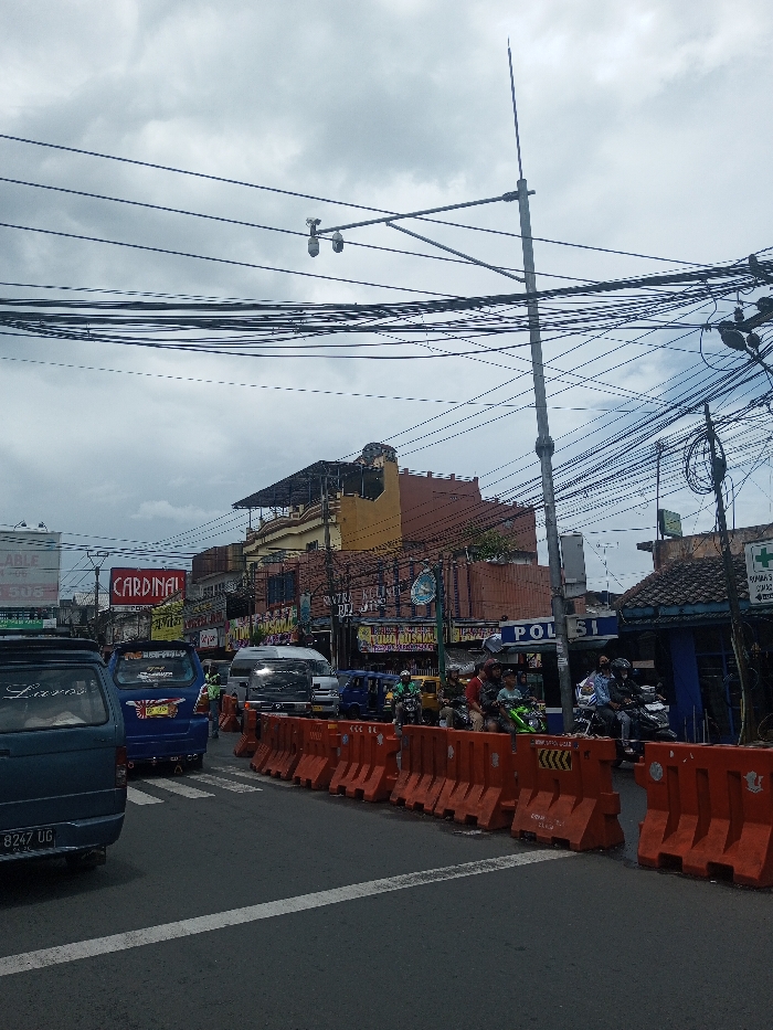 A street scene features vehicles and motorcycles amidst heavy overhead wires. Orange plastic barriers line the road's center, while shops with signage are visible in the background, including "CARDINAL" and "POLISI". The sky is overcast. The general atmosphere is busy and somewhat chaotic, likely in an urban area.