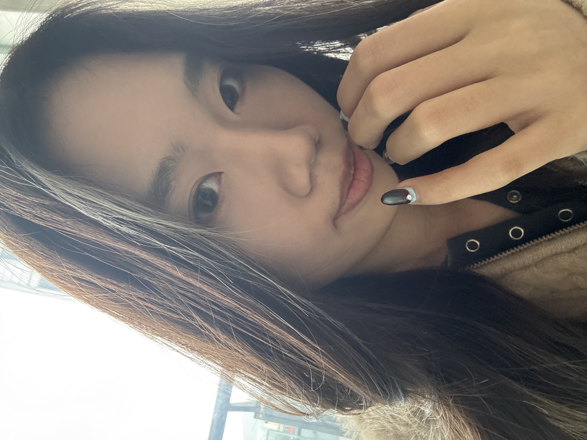 A young East Asian female is depicted in a close-up, high-angle selfie. She has long, dark brown hair with lighter strands, dark eyes, and dark eyebrows, looking directly at the camera with a subtle expression. She is wearing a dark garment with a visible zipper and two silver grommets near the collar, layered under a light brown or beige textured, possibly fuzzy, jacket. Her right hand is raised, with fingers partially obscuring her chin and mouth. The index fingernail on her right hand is painted a dark grey or black with a light blue tip and a small white circular embellishment. The background is brightly lit and blurred, indicating an urban outdoor scene viewed through a window or glass partition. Visible elements include a dark horizontal bar in the upper left, possibly a building railing or window frame, and faint outlines of distant buildings under an overcast sky or diffuse light conditions. The specific location within Nan'an District, China, cannot be determined from the available visual information.