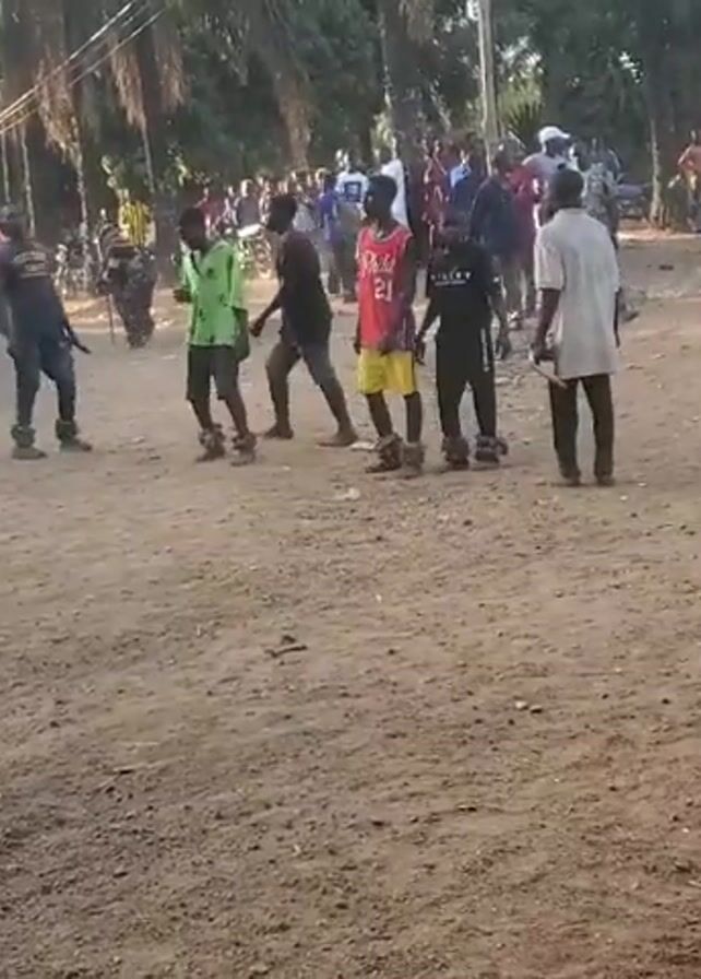 group of people gathered in an open dirt area, possibly a village square or common space. A small group of dancers wearing ankle bells or other rhythmic instruments are performing, their feet moving in a coordinated fashion. The dancers include individuals in traditional African attire along with some dressed in more modern clothing. A crowd of onlookers surrounds the performance area, observing the dancers. The environment features trees and some buildings in the background, suggesting a rural or semi-rural setting. The overall atmosphere seems festive and communal, suggesting a cultural performance or celebration.