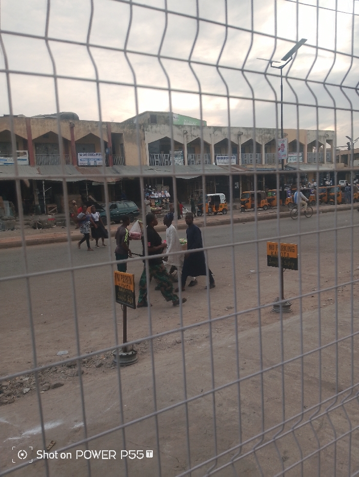 A street scene viewed through a wire fence. Pedestrians walk on a dirt road beside a building with arched storefronts and a partially obscured sign. Vehicles, including three-wheeled taxis, line the street. A solar streetlight is visible. Two signs reading "No Parking" are posted along the roadside. The sky is overcast, and the scene appears to be in a commercial or market area.
