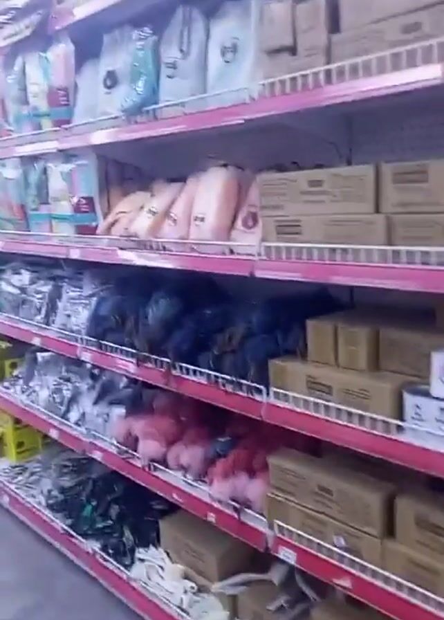 long aisle of shelves in a store. The shelves are red and lined with products, including bags of what appears to be dog or cat food, boxes, and packaged items. The shelves are well-stocked, and the video gives a tour-like feel as it moves down the aisle. The lighting is bright and functional. The overall setting seems to be a well-organized retail environment, possibly a pet supply store or a general store with a pet section.
