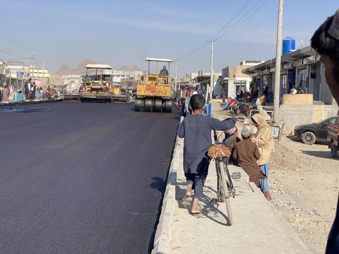 The image captures a road construction scene in Gundigan Village, Afghanistan, during daylight hours