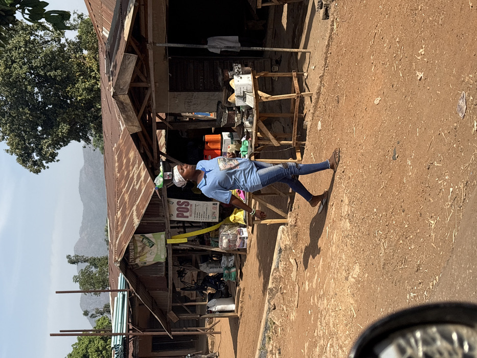 This image depicts an outdoor street scene in the city of Tataura, Nigeria, under bright daylight. The foreground, from a slightly elevated perspective, shows a portion of a silver vehicle rearview mirror on the lower left. The ground is unpaved, consisting of reddish-brown dirt and gravel, exhibiting uneven textures and small debris. Long, distinct shadows are cast from left to right across the ground, indicating strong sunlight. A woman, appearing to be of African descent, is the central figure, walking from left to right across the midground. She wears a light blue short-sleeved t-shirt with a faded graphic design on the front, light blue distressed jeans with tears at the knees, and brown flip-flops. A white and black patterned headscarf covers her hair, and a small, indistinct object appears to be balanced on her head. Her left arm has multiple bracelets, and her posture suggests a steady gait. Her facial expression is neutral, and her gaze is directed forward. Behind the woman, a row of makeshift market stalls or small shops lines the unpaved roadside. These structures are constructed with weathered, rusted corrugated metal roofs and rough wooden frames. The stall directly behind the woman features a prominent white sign with "POS" in red text, displaying a list of services or items. Below the "POS" sign, a green banner with "S'S SAGO BAG" is visible. Various goods are displayed on rustic wooden tables, including plastic containers, orange canisters, what appear to be weighing scales, and other packaged items. To the left, a stall contains large white sacks and a dark-colored two-wheeled vehicle, possibly a motorcycle or bicycle. A yellow fabric piece hangs from its roof. To the right, another stall is partially visible, also featuring items on wooden tables, and a person in white clothing is dimly visible further inside. In the mid-to-far background, sparse green trees are visible. Distant, hazy mountains rise against a clear, pale blue sky. Metal utility poles are seen extending upwards near the leftmost stall. The overall environment suggests an active, unpaved commercial area or thoroughfare.