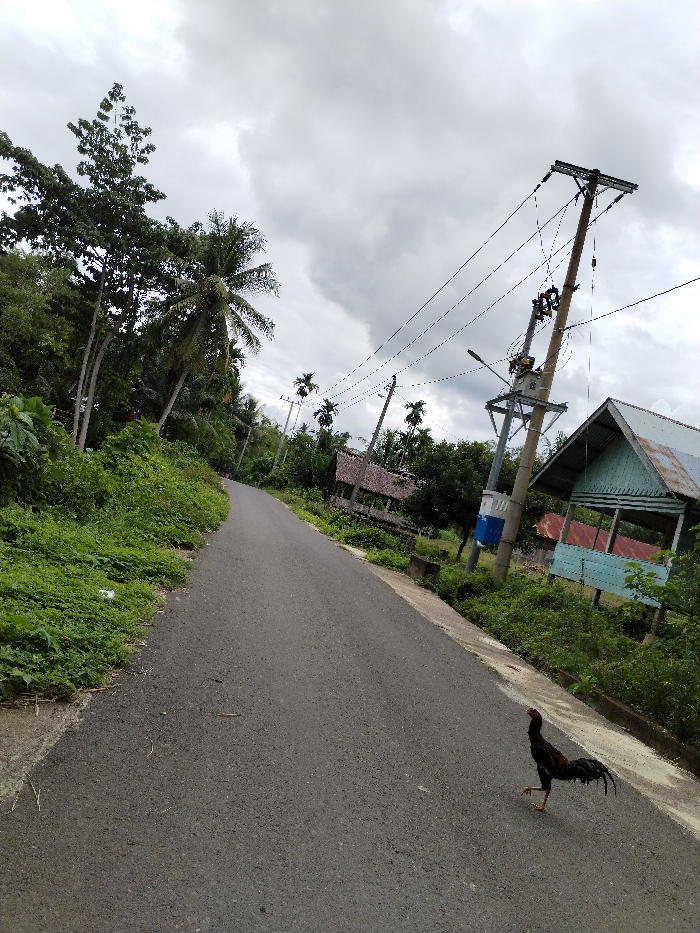 A wide-angle, slightly Dutch-angled photograph depicts an asphalt road scene in Mns Alue, Indonesia, under an overcast sky. The road, dark grey and lacking lane markings, curves gently uphill and to the left, receding into the distance. On the left side of the road, dense green vegetation, including tall trees and a prominent palm tree, rises along a gentle slope. On the right side, a narrow concrete shoulder borders the road, beyond which lies more green foliage. Two open-sided structures are visible: one further back with a thatched roof, and another closer to the foreground painted light blue with a sloped, rusty corrugated metal roof. Several utility poles line the right side of the road. A prominent wooden pole in the mid-ground features a grey electrical transformer unit, a street light fixture, and a blue and white painted band near its base. Multiple electrical wires extend across the frame, connecting the poles. A single rooster is the sole animate subject, positioned in the lower right quadrant of the road. It has predominantly dark, iridescent plumage with black or dark brown body feathers, a dark, full tail, and a red comb and wattles. The rooster is walking from right to left across the asphalt, with its head slightly raised. No human subjects or discernible interactions are present in the scene.