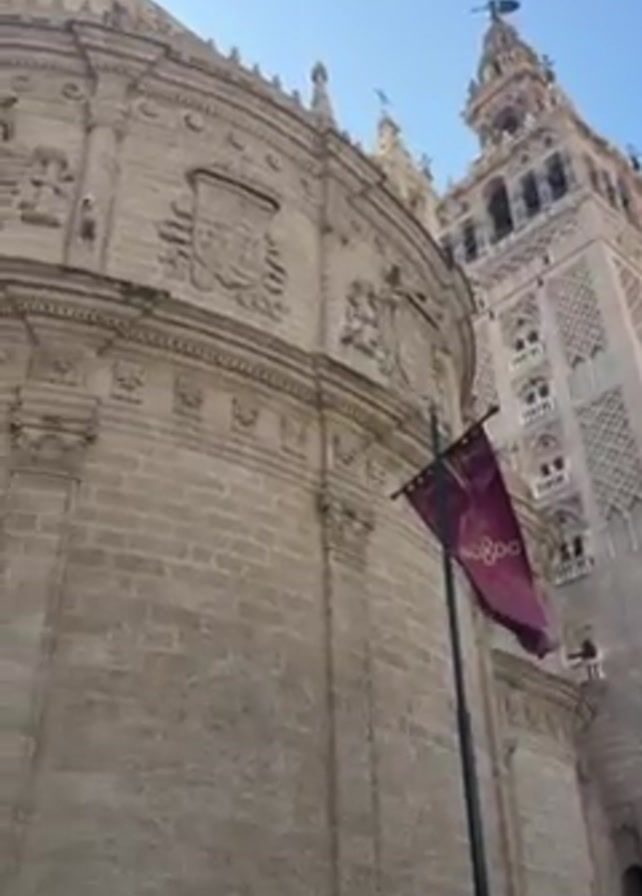 The video presents a low-angle, upward pan across the exterior of a large, ornate building, likely a cathedral or significant historical structure. The building is constructed of light-colored stone, possibly limestone or sandstone, and exhibits elaborate architectural details including carvings, spires, and a tower with intricate latticework. The pan starts with a view of a burgundy-colored banner displaying a stylized design or logo. The camera then moves across the building's facade, highlighting its rounded sections adorned with heraldic crests or emblems. The architectural style appears to be a mix of Gothic and Renaissance influences, evident in the pointed spires and decorative cornices. The sky is a clear, bright blue, providing a striking contrast to the building's pale coloration. No people are visible in the video, and the scene appears to be quiet, with only the ambient sounds of the environment audible. The overall impression is one of grandeur and historical significance, emphasizing the building's architectural complexity and imposing scale.