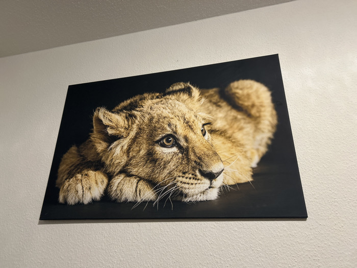 An indoor scene captured from a low angle shows a large, rectangular art print mounted on a textured, off-white wall. The print displays a close-up, horizontal photograph of a lion cub. The cub is lying down, resting its head on its front paws, which are visible in the lower left portion of the print. Its fur is golden-brown, and its eyes are light brown, gazing slightly to the right within the frame. Prominent white whiskers extend from its muzzle. The background of the print is solid black, providing high contrast to the cub. The print itself has noticeable thickness and black edges. Above the print, and to its left and right, the textured wall is visible. A smooth, light-colored ceiling appears in the upper left section of the image, meeting the wall. The specific city location is not discernible from the image content.