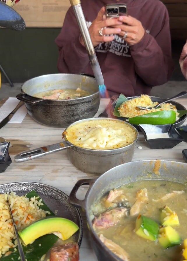 person using a blowtorch to melt cheese in a small metal saucepan, likely part of a dish being prepared at a table setting. The table is filled with various dishes served in metal pots and on plates lined with banana leaves, including what appears to be soup with avocado and rice. A person sits across the table looking at their phone and appears disinterested in the blowtorch application. The scene suggests an outdoor dining setting.