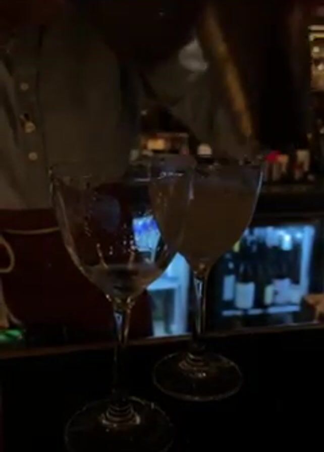 A bartender pours a cocktail through a strainer into two stemmed cocktail glasses sitting on a dark bar top. The bartender is wearing a light blue shirt, and a maroon apron is slung over his hip. He holds a metal cocktail shaker up and to the right, as it pours a light-colored, cloudy liquid through the strainer into the glasses. The glasses have delicate etching. The bar is dimly lit, and there is ambient bar noise in the background. Behind the glasses is a stainless steel refrigerator filled with bottles. On top of the refrigerator are various bottles of alcohol.