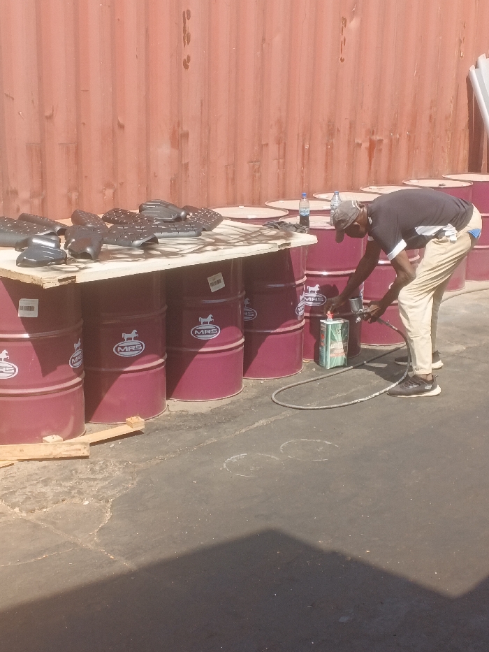 A single adult male is depicted in an outdoor, industrial-style setting in Abuja, Nigeria. The individual, wearing a dark t-shirt, light-colored trousers, a baseball cap, and sneakers, is bent forward, actively operating a handheld spray gun. A hose from the spray gun extends to the ground, where a green and white rectangular container is also visible. The background consists of a tall, corrugated reddish-brown metal wall or shipping container. In the mid-ground, a makeshift workbench is constructed from a light-colored wooden plank resting on top of several maroon-colored metal barrels. Each barrel features a white circular logo with "MRS" and a horse icon. Numerous dark, irregularly shaped objects, resembling molded parts or protective gear, are arranged on the wooden plank. Two clear plastic water bottles are present on barrels to the right of the workbench. The ground is a dark, worn paved surface with some lighter patches and two distinct white circular markings in the foreground. White cylindrical objects are leaning against the background wall on the far right. The scene suggests a manufacturing, finishing, or repair operation, likely involving spray application of a substance.
