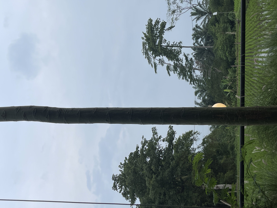 This image portrays a rural landscape in Limbangan Sari, Indonesia, under an overcast sky. A tall, dark brown tree trunk, exhibiting horizontal ring-like textures, dominates the central vertical axis of the frame. A spherical, illuminated yellowish light fixture is visible, suspended behind the right side of this trunk at mid-height. Below the light and trunk, a black horizontal railing stretches across the mid-ground. Immediately behind the railing, a flooded rice paddy with rows of young green plants is present. The foreground contains tall, light green grasses with some white feathery inflorescences. The background features dense tropical foliage: large, dark green trees on the left, and a mixture of tall, slender trees with high canopies and several palm trees on the right. No individuals are depicted in the scene.