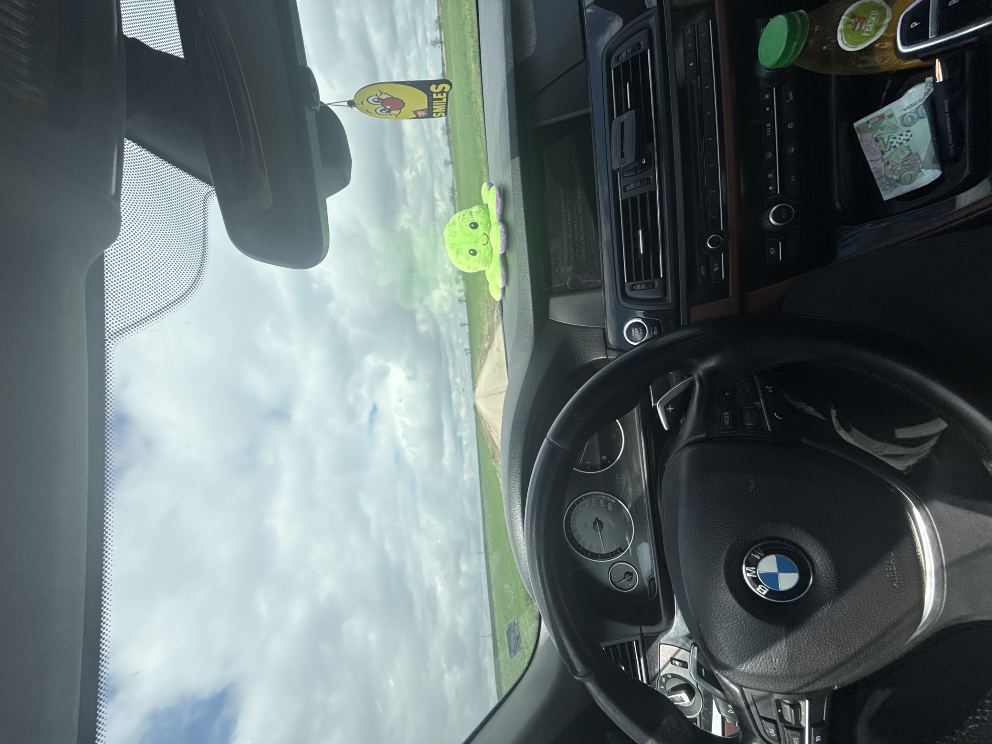 A view from inside a BMW vehicle, facing forward. The steering wheel prominently displays the BMW logo. The dashboard holds a green plush octopus and a "SMILES" air freshener. To the right, a bottle with a green lid and currency can be seen. Through the windshield, the outside scene appears to be a field under a cloudy sky.