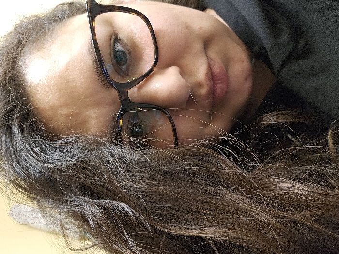 A close-up, portrait-oriented photograph features a single individual located indoors in Nuremberg, Germany. The subject has fair to medium skin tone, with long, dark brown, wavy hair partially obscuring the left side of their face. They are wearing tortoise-shell patterned, square-framed eyeglasses; reflections from a light source are visible on the lenses, especially on the left. The right eye's iris is light-colored. The nose is visible, and the lips are closed in a neutral expression. A dark, likely black, hooded garment covers the neck and shoulders. The background is a uniformly light-colored and out-of-focus surface.