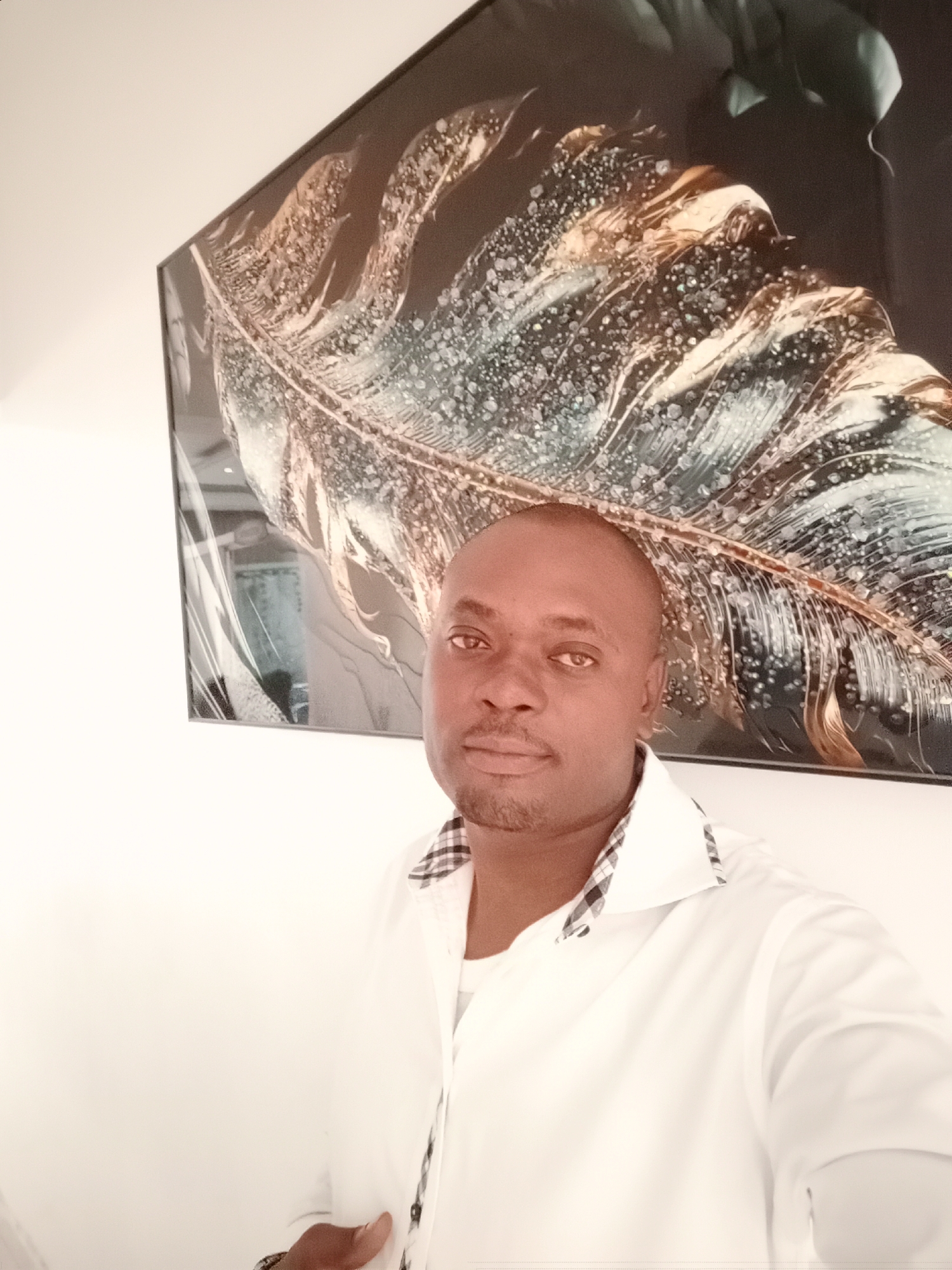 A medium shot depicts a man in a white, collared shirt with a checkered pattern on the inside of the collar. He is bald and has dark eyes. He is positioned in front of a wall. Behind him, and slightly above his head, is a large framed artwork featuring a feather-like design with metallic and reflective elements. The location is identified as Gwarinpa, Nigeria, based on given information.