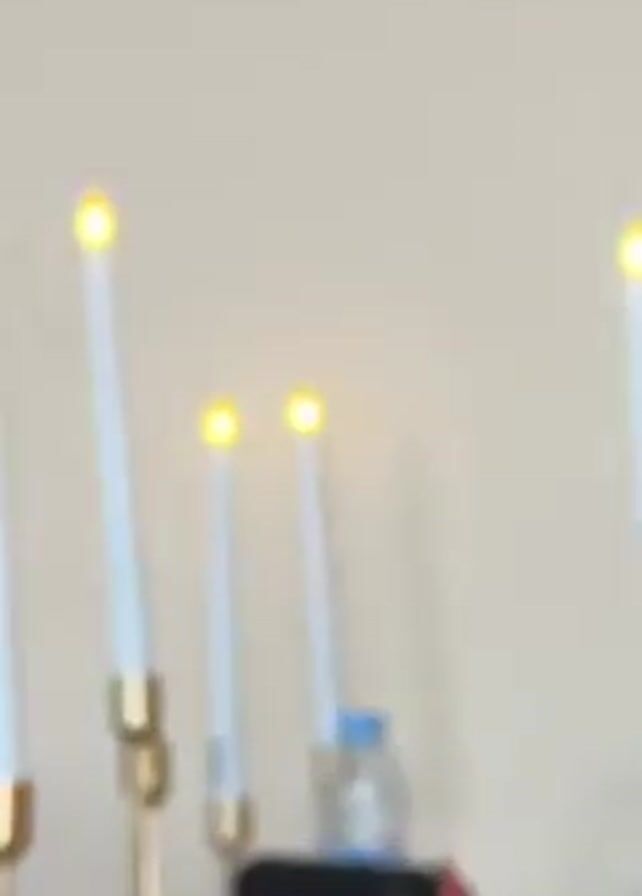 In what appears to be a classroom setting, three young men are present. One is sitting at a desk with his head down, seemingly resting or sleeping. At the adjacent desk, four electric candles stand tall, emitting a warm, flickering glow. Two other young men are engaged in conversation beside the lit candles. Their posture suggests a relaxed and casual interaction. Additionally, notebooks, bags, and other school-related items are scattered on the desks, emphasizing the classroom environment.