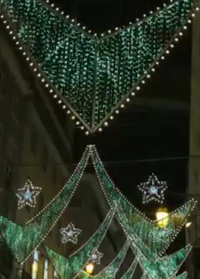 At night, Christmas decorations hang over a street lined with buildings. The decorations are shaped like arrowheads or downward-pointing triangles and are composed of strings of lights. The lights change color between white, green, and purple. Traditional street lamps are also visible. The video is filmed from a low angle, looking upwards.