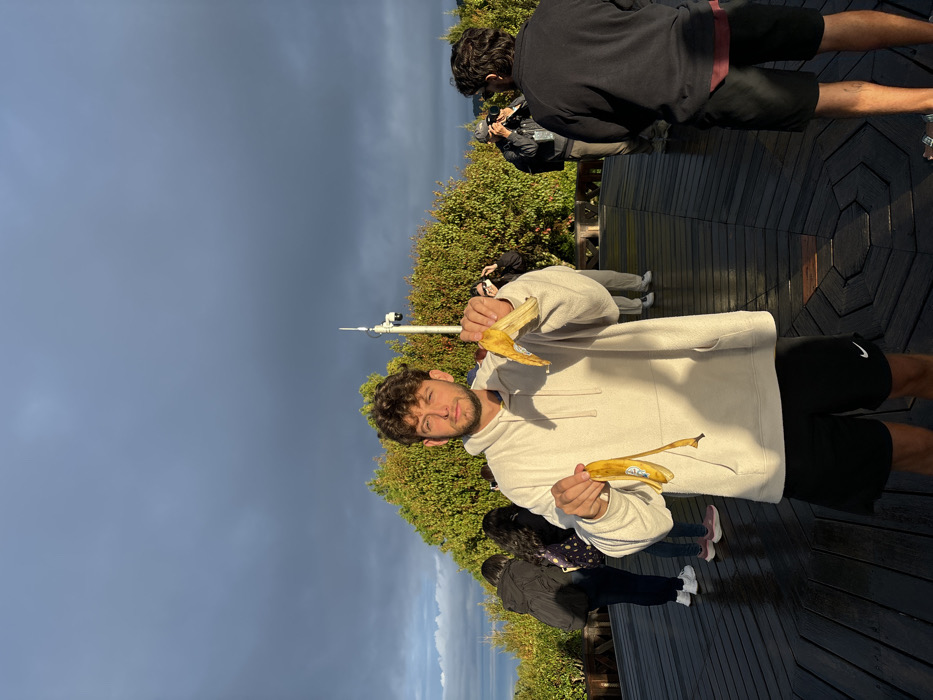 The image depicts an outdoor observation deck in Alishan Township, Taiwan, under a partially overcast sky with dark gray clouds and patches of sunlight on the left. The ground consists of dark brown wooden decking arranged in an octagonal pattern. In the foreground, a male subject with light skin, dark curly hair, and a beard stands facing the camera. He wears a light beige hooded sweatshirt with a front pocket and black shorts with a white Nike logo on the left leg. He holds a yellow banana peel in each hand, presenting them to the camera. His expression is neutral. Behind the main subject, a white pole equipped with a surveillance camera and what appears to be an antenna is visible. Dense green foliage forms a backdrop. Several other individuals are present on the deck. To the main subject's right, a male figure stands with his back partially to the camera, wearing a dark long-sleeved shirt and dark shorts. Further right, a person in a dark cap holds a camera to their face, aiming towards the left. To the main subject's left, multiple individuals are visible; one woman in a dark jacket and pants with white shoes stands facing away from the camera, and another person wears a light-colored top and a white face mask. Shadows are cast by the subjects and objects, indicating strong directional sunlight from the left.