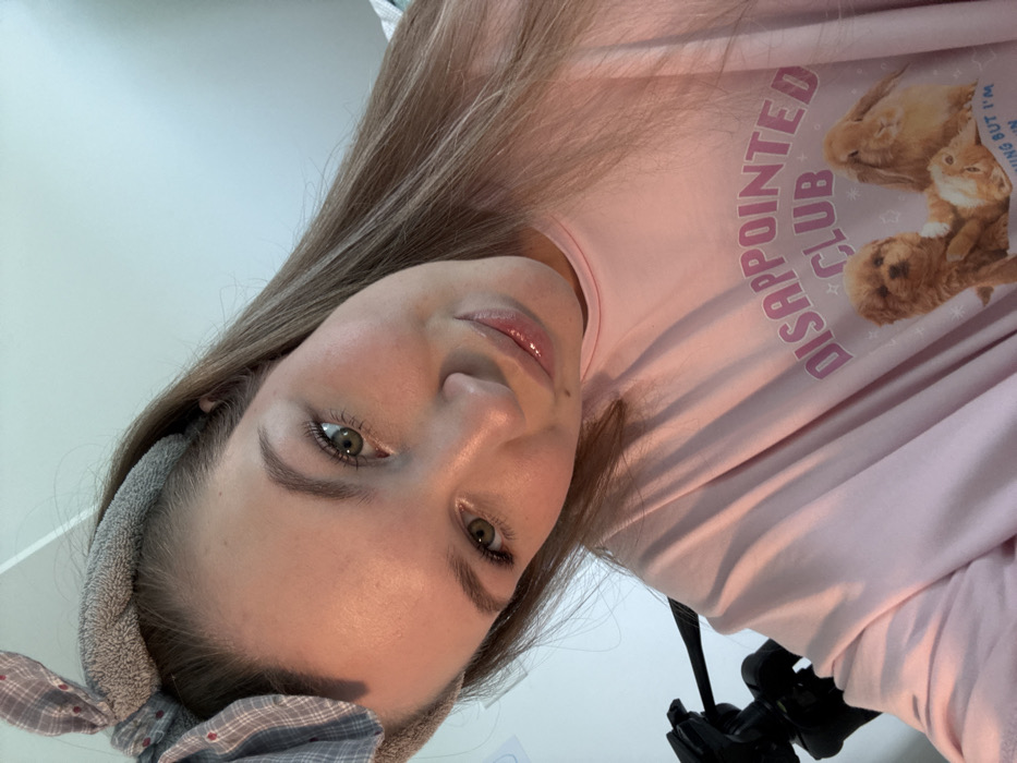 A young female is depicted in a close-up portrait, facing the viewer with a slight smile and her head tilted to her right. She has long, light brown hair and green eyes, with a fair complexion and glossy lips. She wears a grey terry cloth headband, which features a grey and white plaid bow with small red dots on the left side, pulling her hair back from her forehead. Her attire consists of a pink, long-sleeved t-shirt printed with the text "DISAPPOINTED CLUB" in purple, positioned above an image of a brown puppy, a light brown lop-eared rabbit, and a smaller light brown rabbit or kitten. The background is a plain, light-colored wall, indicating an indoor setting. A black object, possibly a component of a camera stand or tripod, is partially visible on the left side of the frame behind her shoulder. The scene is located in the city of Vozdovac Urban Municipality, Serbia.
