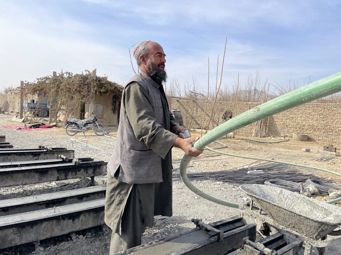 A bearded man, wearing a grey vest over an olive-green tunic and a red-and-white patterned cap, holds a thick green hose with both hands, appearing to direct its contents into rectangular molds in Nakhonay, Afghanistan