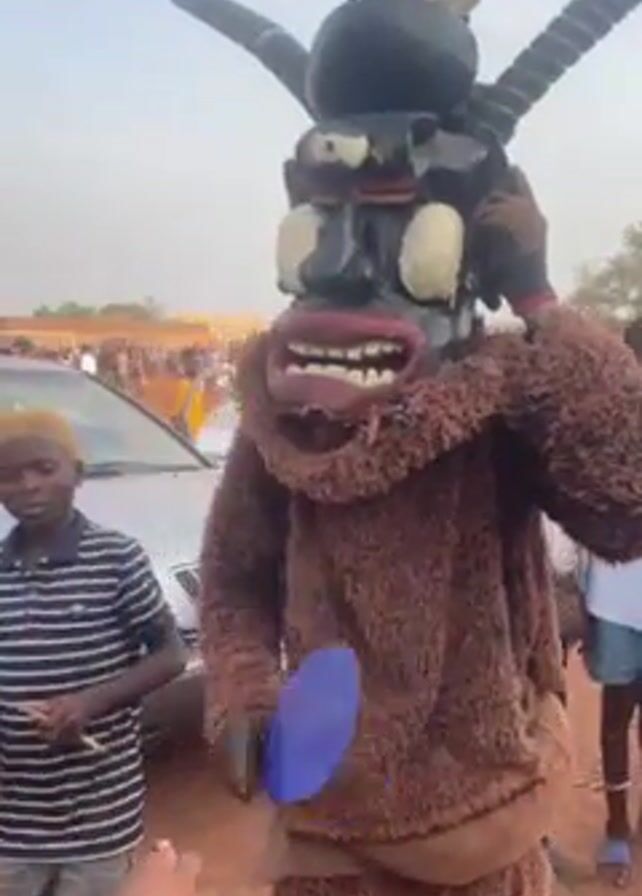 person in a large, elaborate costume standing in a dusty, crowded outdoor setting. The costume consists of a brown furry body suit and a large black mask with white and red accents, featuring a prominent mouth with visible teeth and large horns. The mask also has additional carvings on top. A silver-colored car is parked nearby, and numerous people are visible in the background, some wearing brightly colored clothing. A small blue paddle is briefly held out towards the costumed person. The person in the costume moves slightly, occasionally adjusting the mask. A thin rope or wire is strung along the ground, seemingly to separate the costumed person from the crowd. The overall atmosphere appears festive.