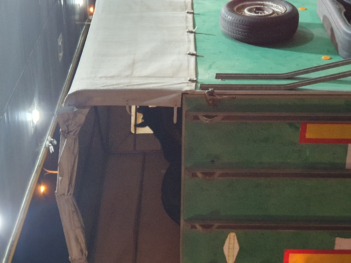 The scene depicts a dark-colored horse positioned within a two-tone horse trailer, captured at night or under artificial lighting conditions. The trailer's lower section is green, featuring vertical metal supports, rectangular red and yellow reflective markings, and a diamond-shaped emblem on the side. An external spare tire is mounted on the trailer's green side, above a black undercarriage component. The upper part of the trailer is enclosed by a light beige canvas cover. The horse's head, ears, and upper back are visible in silhouette against the trailer's interior. The background reveals an overhead structure with two recessed white lights and a single distant orange light source. No specific visual identifiers within the image itself confirm the precise location in the city of Ramla, Israel.