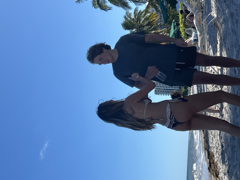 A bright daylight scene depicts a beach in Key Biscayne, United States, featuring two primary individuals in the foreground