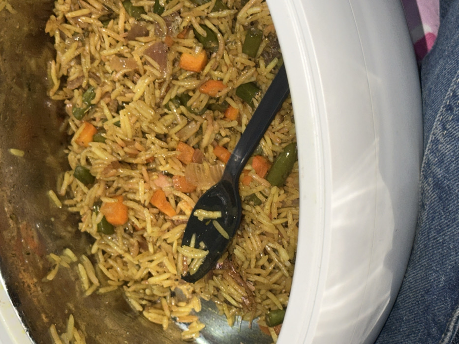 A close-up shows a container filled with rice pilaf. The rice is mixed with chopped vegetables, including carrots, green beans, and onions. A black plastic spoon rests on top of the food. The container appears to be made of metal on the inside and white plastic on the outside. A person wearing denim jeans is seated next to the container.