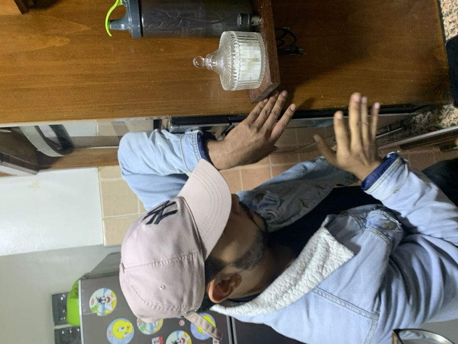 A person in a denim jacket and a pink baseball cap stands next to a wooden countertop. The countertop has a water bottle and a decorative glass container filled with white cubes on it. The person is gesturing with both hands raised in the air. A refrigerator with cartoon character stickers is visible in the background. The flooring is tiled, and the wall is painted with beige tones.