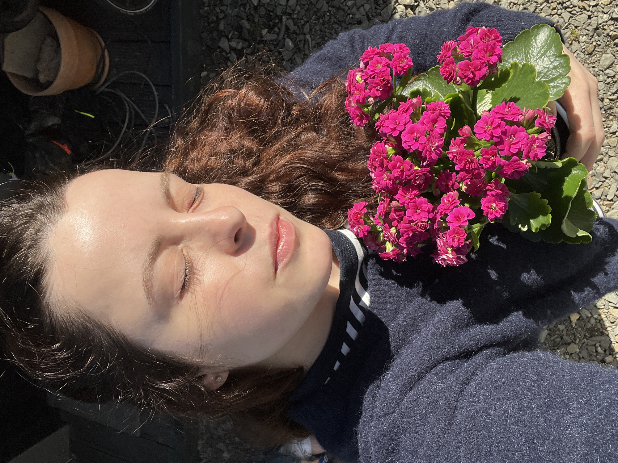 A young, light-skinned person with closed eyes lies outdoors, with her head resting against a navy blue sweater with a white-striped collar. She has auburn, curly hair. Her left cheek is visible, with a subtle blush color. She is holding a potted plant with bright pink flowers. To the top left of the image, there is a terracotta pot. The ground around her appears to be covered in gravel or small stones. The location is likely Gangloff, Germany.
