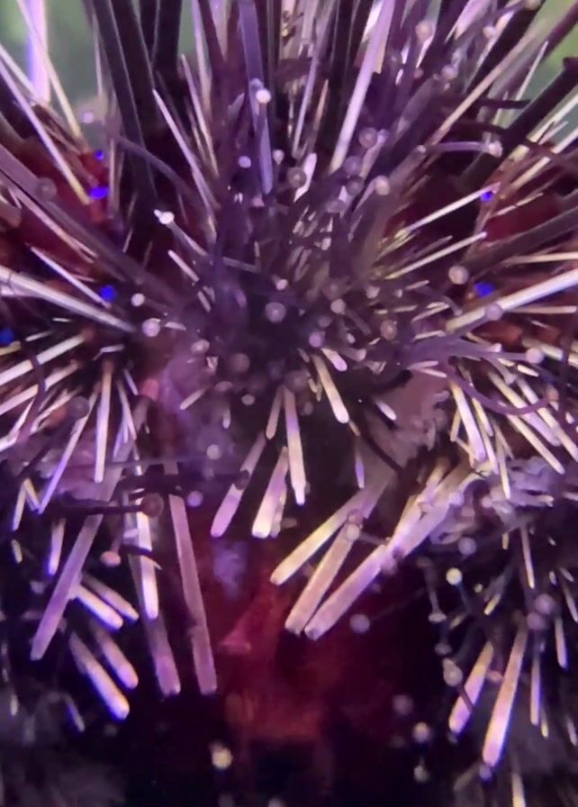 sea urchin in an aquarium. The urchin is dark purple and covered in spines. The spines are long and thin, and they radiate out from the urchin's body. There are also smaller white spots on the body of the urchin. The urchin is sitting on the bottom of the tank, and there are some rocks and plants around it. The water in the tank is clear, and the background is a mix of green and brown.