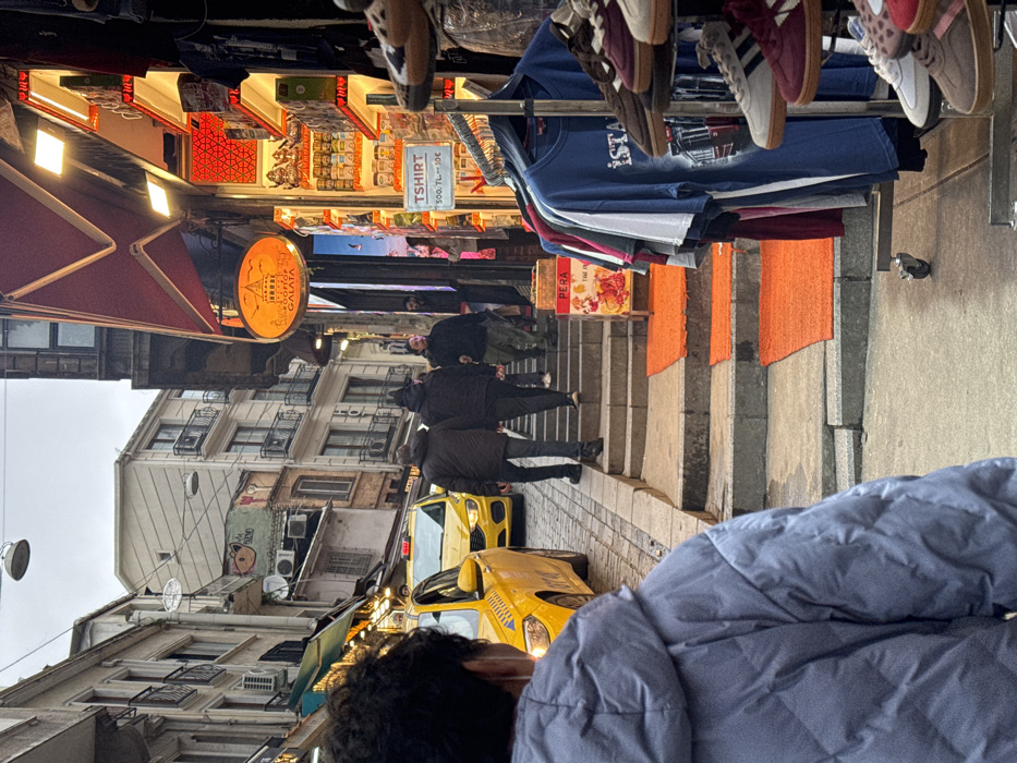 The image portrays a bustling, inclined street in the Beyoğlu district of Istanbul, Turkey, under overcast conditions. In the immediate foreground, the back of a person wearing a light blue puffer jacket is visible, positioned on the left side of the frame. To their left, a yellow taxi with its headlights on is present on a cobblestone street portion. The street transitions into a series of ascending concrete steps, where three distinct orange rectangular mats are laid out. A mobile display rack featuring t-shirts and sneakers stands to the right of these steps. One t-shirt clearly displays "İSTANBUL" with a tram graphic. A visible sign indicates "T-SHIRT 500.TL - 10 €". Above, an illuminated round sign for "ROOFTOP GALATA," featuring a tower silhouette, is affixed to the storefront. Adjacent to the steps on the right, a small wooden stand with a "PERA" label displays fruit. Mid-ground details include several pedestrians ascending the steps. Two men in dark jackets and trousers are prominent, followed by at least three other individuals. Further up the street, a second yellow taxi is partially visible. The background consists of multi-story buildings lining both sides of the street, featuring balconies and visible air conditioning units. One building in the upper-mid-ground displays graffiti resembling a cartoon pig's face. Overhead streetlights are suspended. The scene reflects a lively commercial and pedestrian thoroughfare.