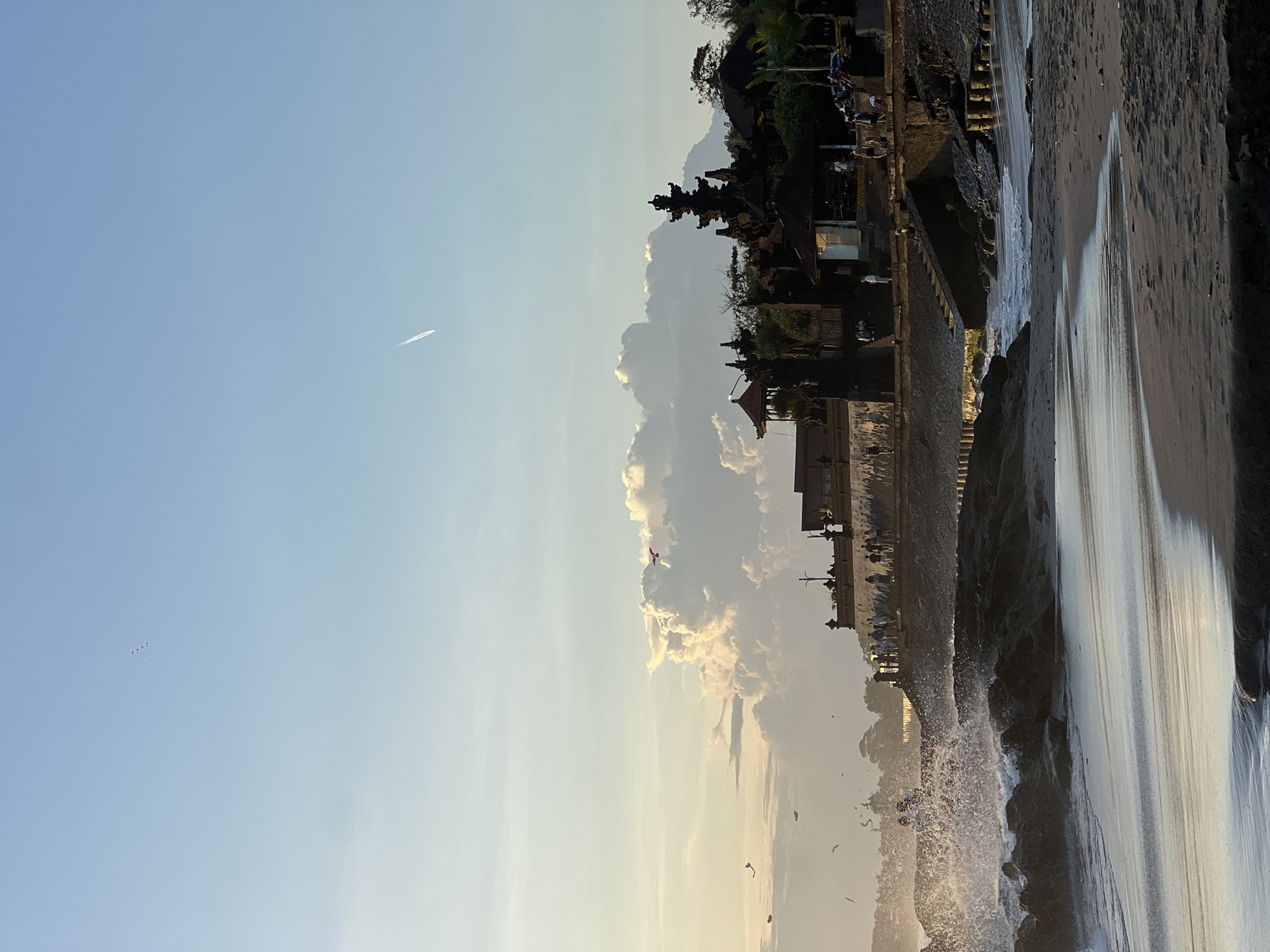 The image depicts the coastline of Canggu, Indonesia at sunset. The view is dominated by a temple complex built along the shoreline, with its layered structures silhouetted against the sky and clouds. To the right of the temple is a sandy beach, with waves crashing against the shore. The sky ranges from blue at the top to golden-yellow near the horizon, with a jet stream visible in the upper left. Several kites are flying in the sky, and birds are visible above the beach. People are visible along the wall next to the temple.