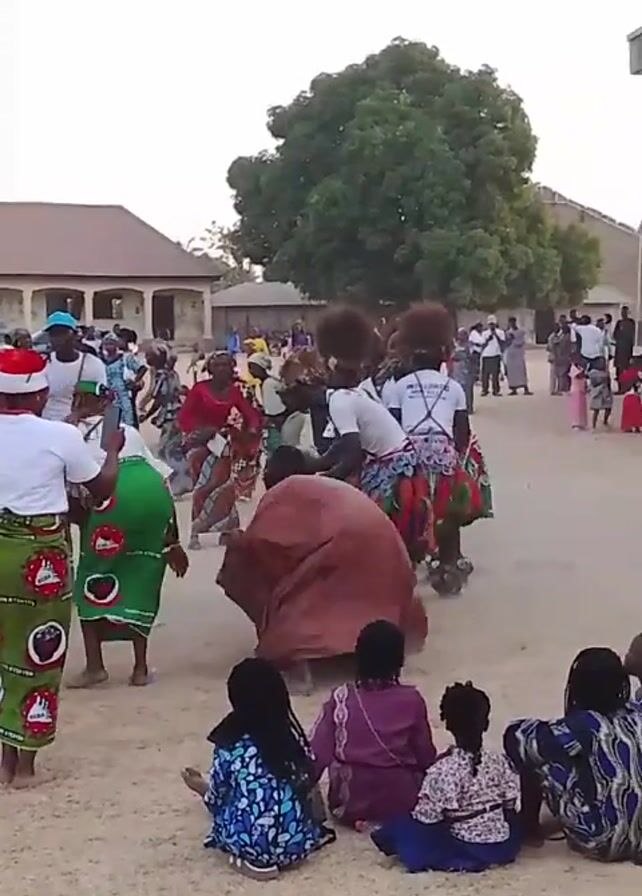 group of people dancing in an outdoor area. Several individuals are sitting on the ground watching the dance, while others stand around the perimeter. The dancers are wearing colorful clothing, with one dancer covered in a brown cloth. A building and a large tree are visible in the background. The ground appears to be dirt or sand.