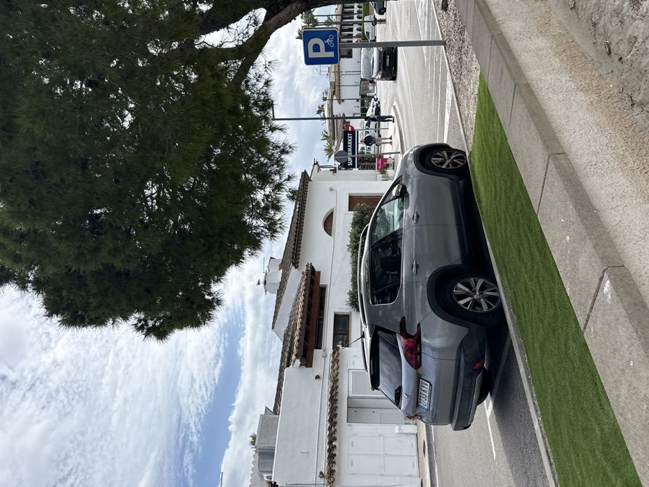 This image captures a street scene at an intersection in Alcúdia, Spain, under a partially cloudy sky. In the foreground, a concrete retaining wall topped with a strip of artificial green turf runs horizontally. A grey Peugeot 2008 SUV, bearing license plate "2733 KVV," is parked curbside on the left, facing away from the camera. Beyond the parked vehicle, a paved road extends into an intersection. On the left side of the street, two-story white buildings with red-tiled roofs are visible. One building features a prominent white chimney with a small, white bird perched on its top. Near the intersection, a street sign with "SUPERMARKET" in white text on a dark blue background is mounted on a pole. Two individuals are standing on the sidewalk adjacent to the "SUPERMARKET" sign; one is partially obscured, while the other wears light-colored clothing. A dark-colored van is observed driving away from the viewer on the street beyond the intersection. On the right side of the frame, a blue square sign with a white 'P' and bicycle symbol is mounted on a pole, indicating parking, possibly for bicycles. A large tree with dense, dark green foliage occupies the upper right portion of the image, its trunk visible on the far right. The scene is illuminated by daylight.