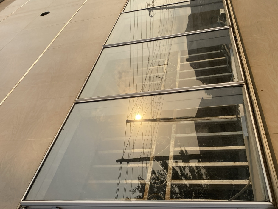 Three rectangular windows are set into a beige tiled wall, reflecting the outside world. The reflections show power lines, a staircase with ornate metal railings, and trees. The sun reflects brightly in the middle window. The windows are framed with white metal. The photograph is taken from an angle looking up at the windows. A dark circle is visible on the wall above the top window.