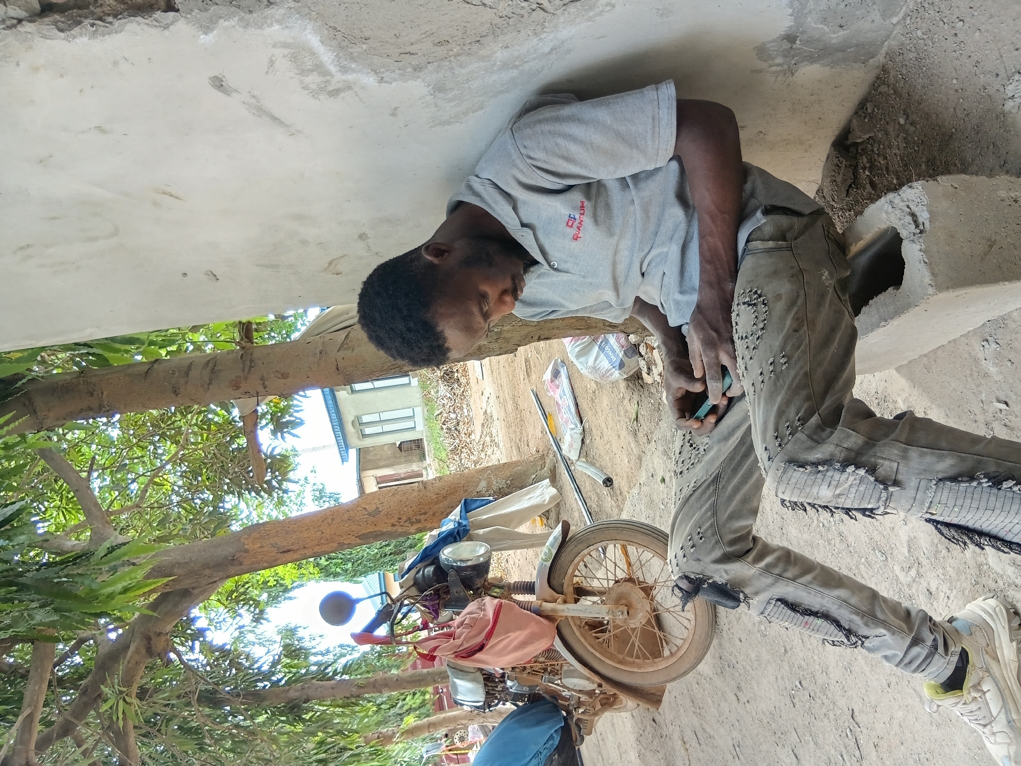 An adult male is seated outdoors on a concrete block, leaning against a light-colored, weathered wall in Ota, Nigeria. He wears a grey polo shirt with a red "QUANTUM" logo on the left chest, distressed grey jeans with visible rips and textured patches, and white athletic shoes with yellow accents. His dark hair is short, and he has a beard. He is looking down intently at a light blue-cased smartphone held in both hands. To his left, a brown dirt bike-style motorcycle is parked on an unpaved dirt ground. A light pink bag hangs from the motorcycle's handlebars, and a blue fabric item is draped over its seat. Several trees with green foliage provide shade over the scene. In the background, multiple buildings are visible, including one with a light blue roof and another with distinct white window frames. Metal pipes and a white plastic bag are present on the dirt ground in the mid-background. The scene is illuminated by natural daylight.
